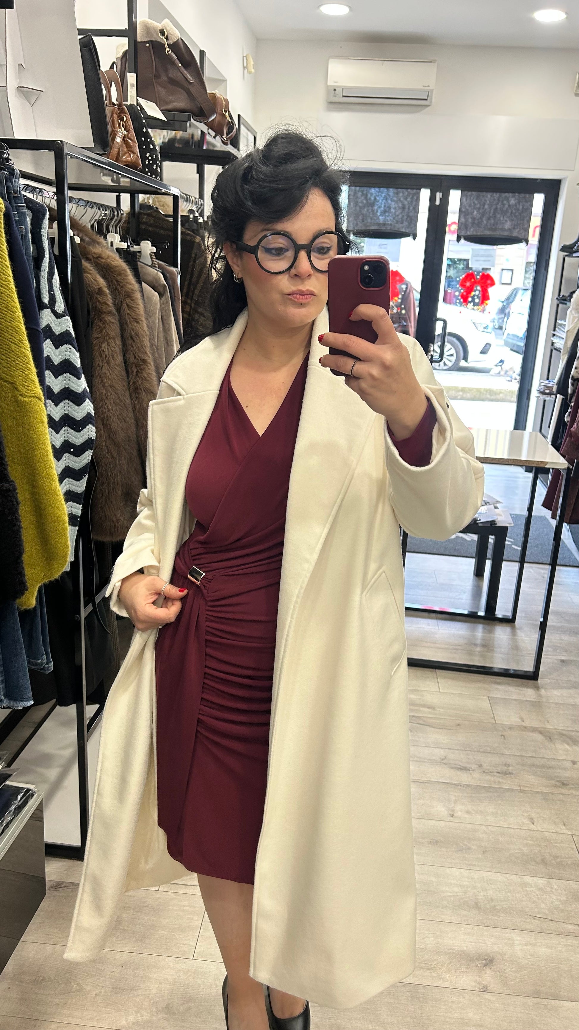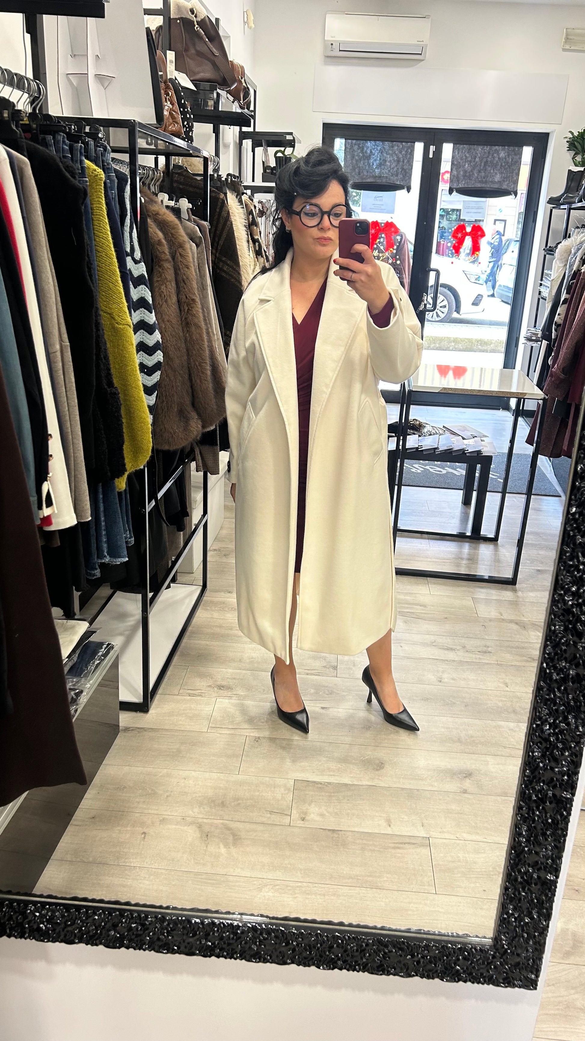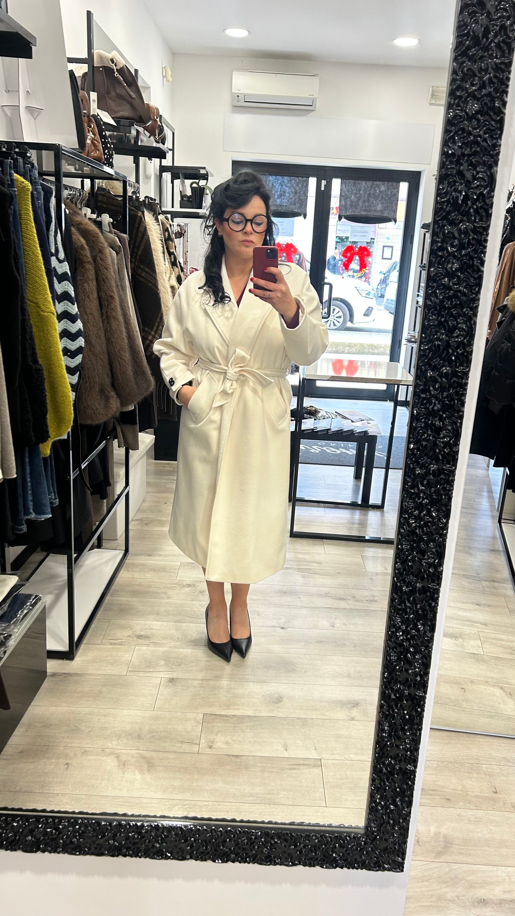 La cintura in vita valorizza la silhouette, mentre il tessuto morbido garantisce comfort e calore nelle giornate più fredde.