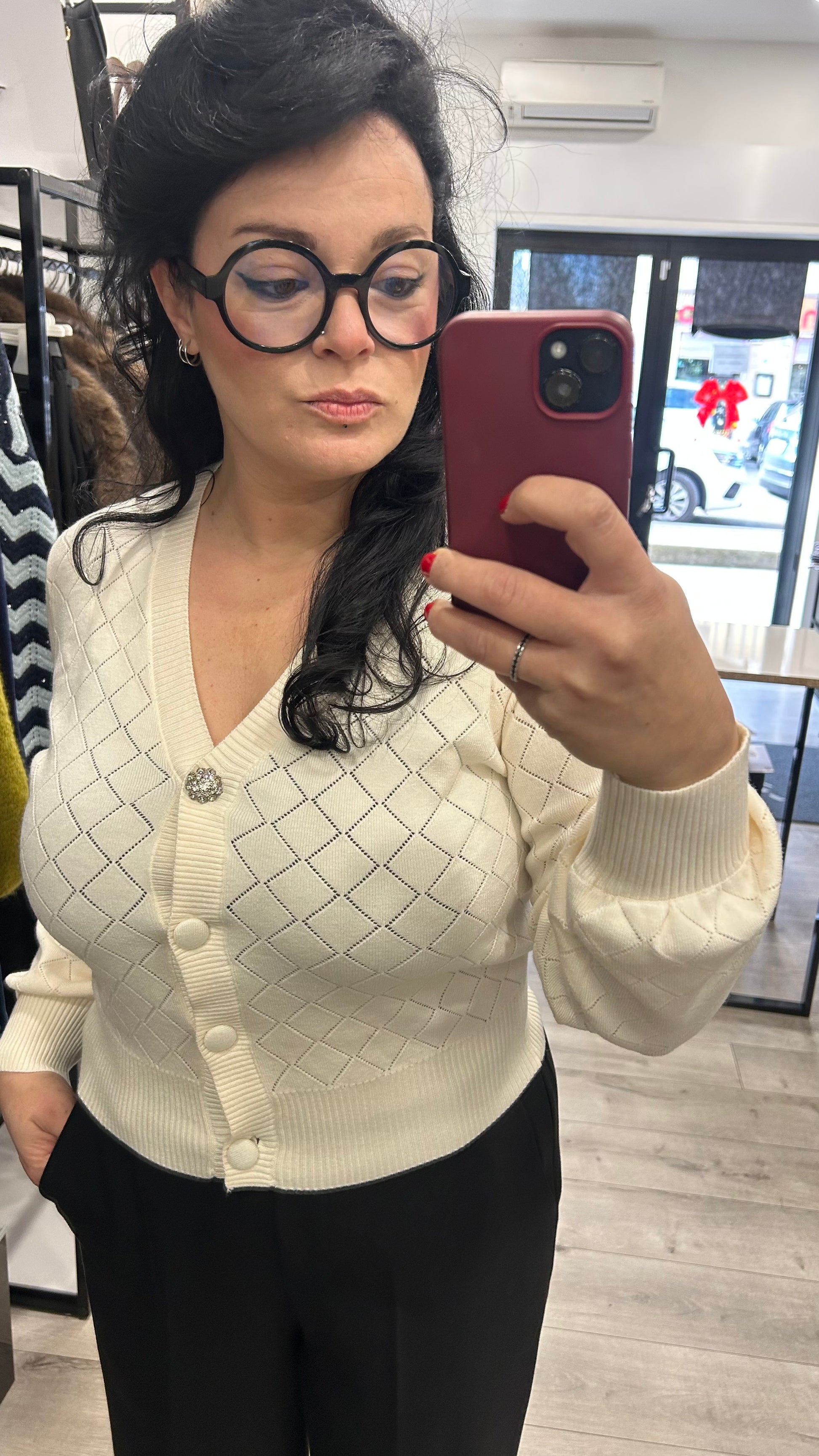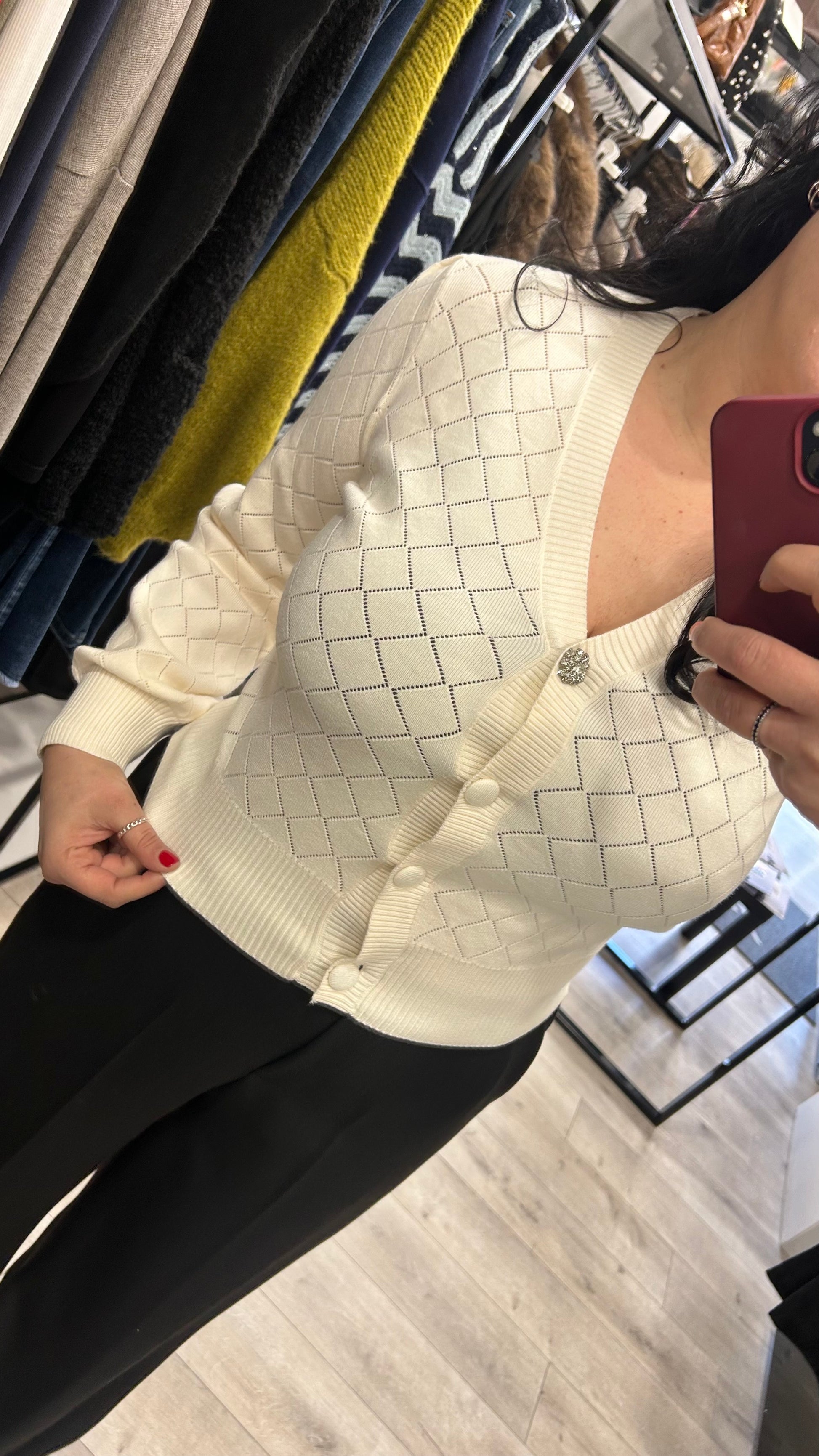 Cardigan a rombi dal design raffinato, caratterizzato da scollo a V che slancia la figura e da bottone gioiello che aggiunge un tocco luminoso ed elegante.
