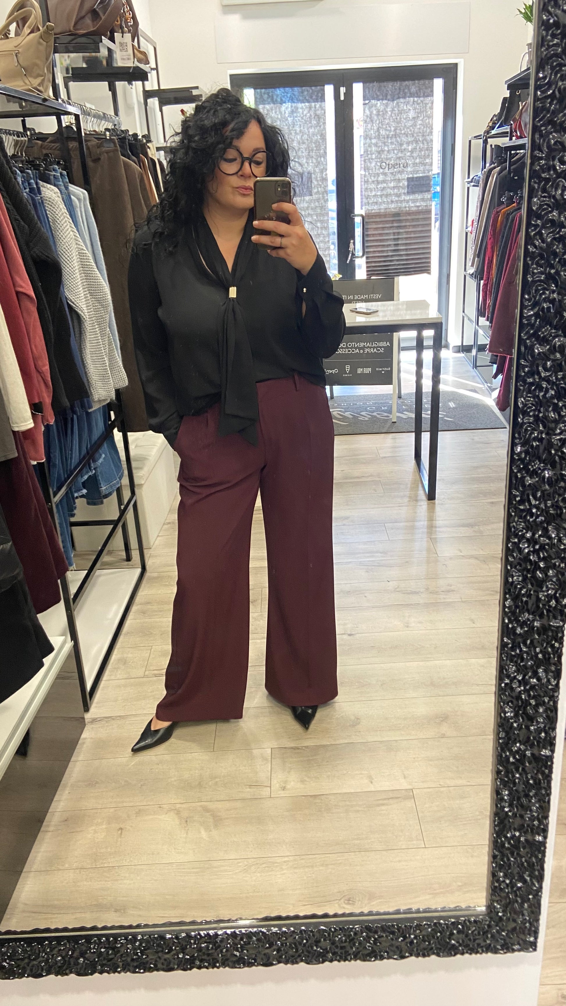 Linee ampie, tessuto fluido e caduta perfetta: questo pantalone palazzo nero è la base ideale per look da ufficio, eventi o uscite serali.