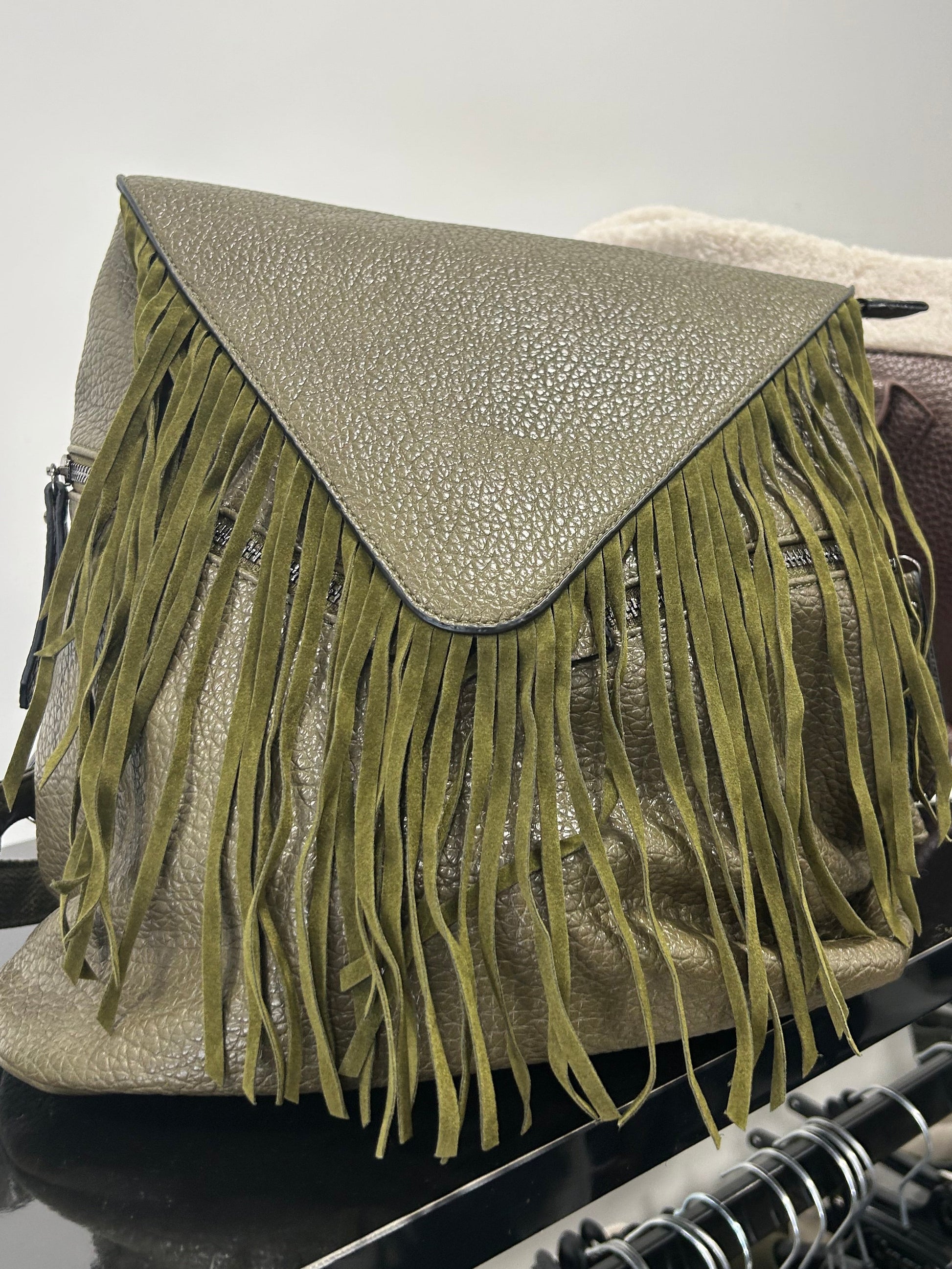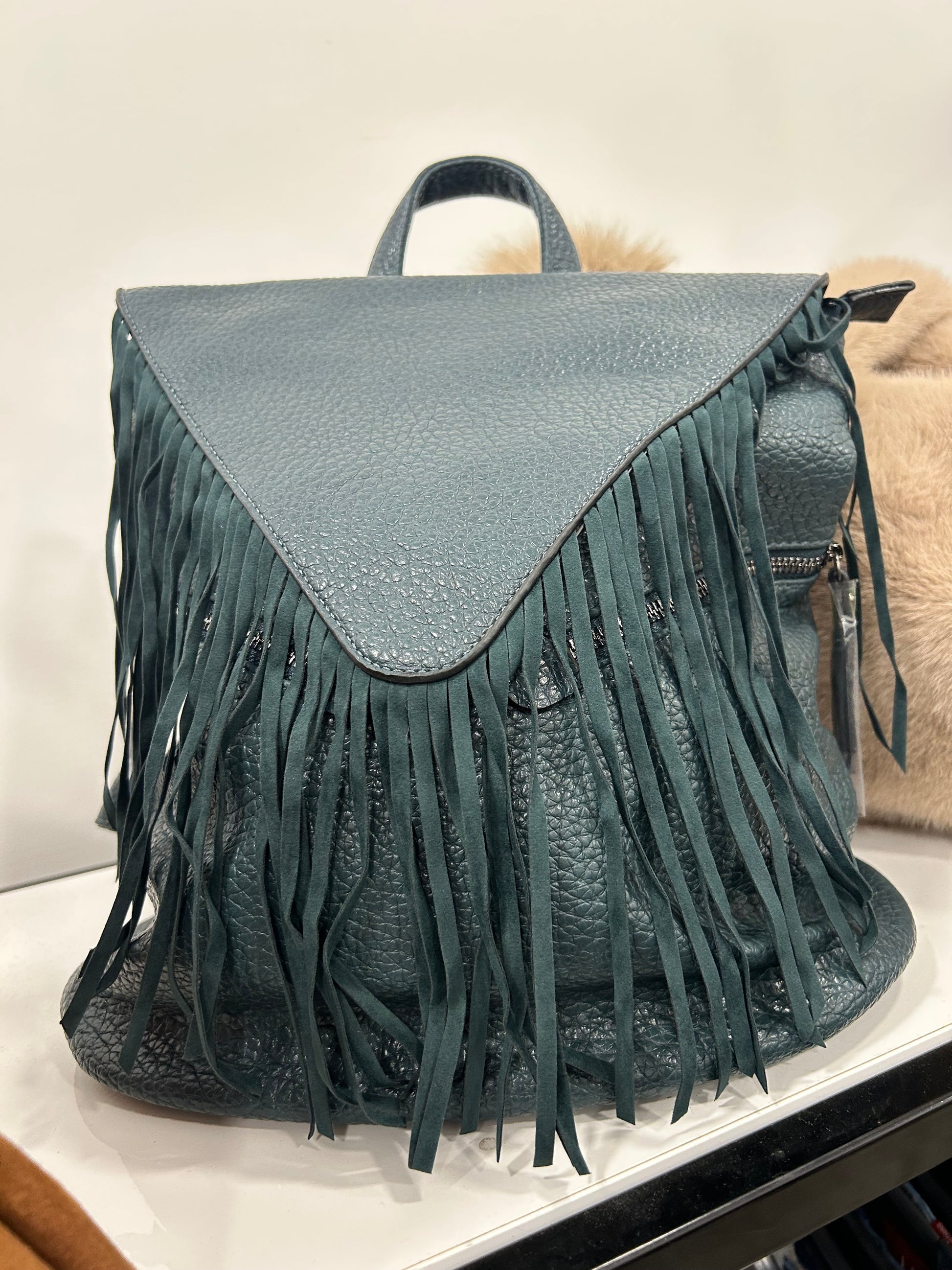 Questo zaino in ecopelle unisce comfort e design grazie al suo look glam impreziosito da frange decorative, per un effetto chic e moderno.